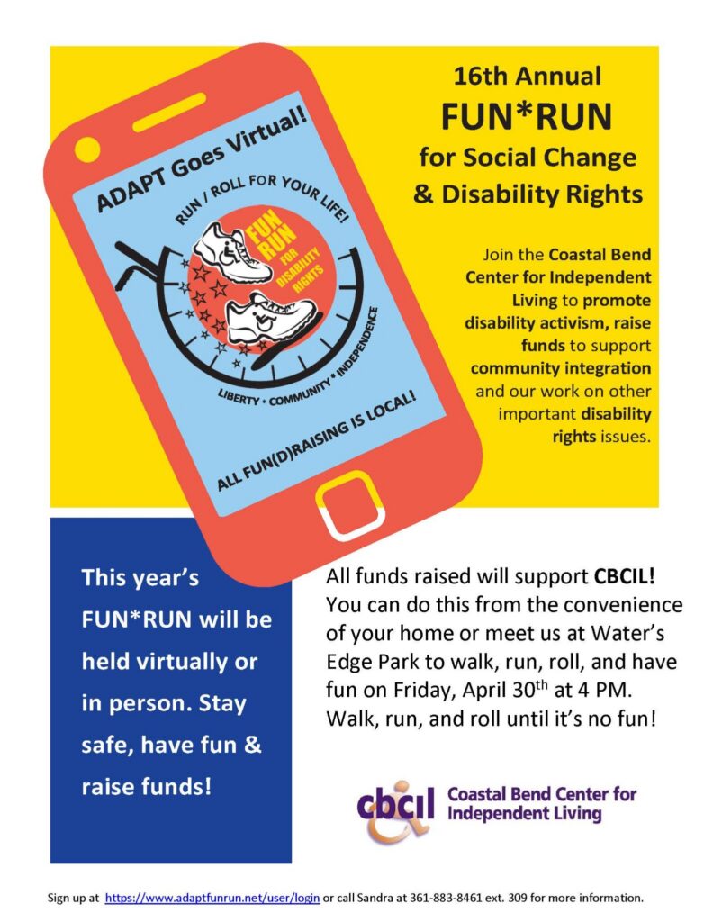 Please join CBCIL as we engage in the 16th Annual FUN*RUN as we raise funds (for CBCIL and ADAPT) to promote disability activism and community integration. How can you get involved, you can register as a runner, walker, roller link to register as a runner https://adaptfunrun.net/user/register – remember you can participate in person or virtually. CBCIL is hosting a FUN*RUN event on April 30th at 4pm. Flyer with more details attached.