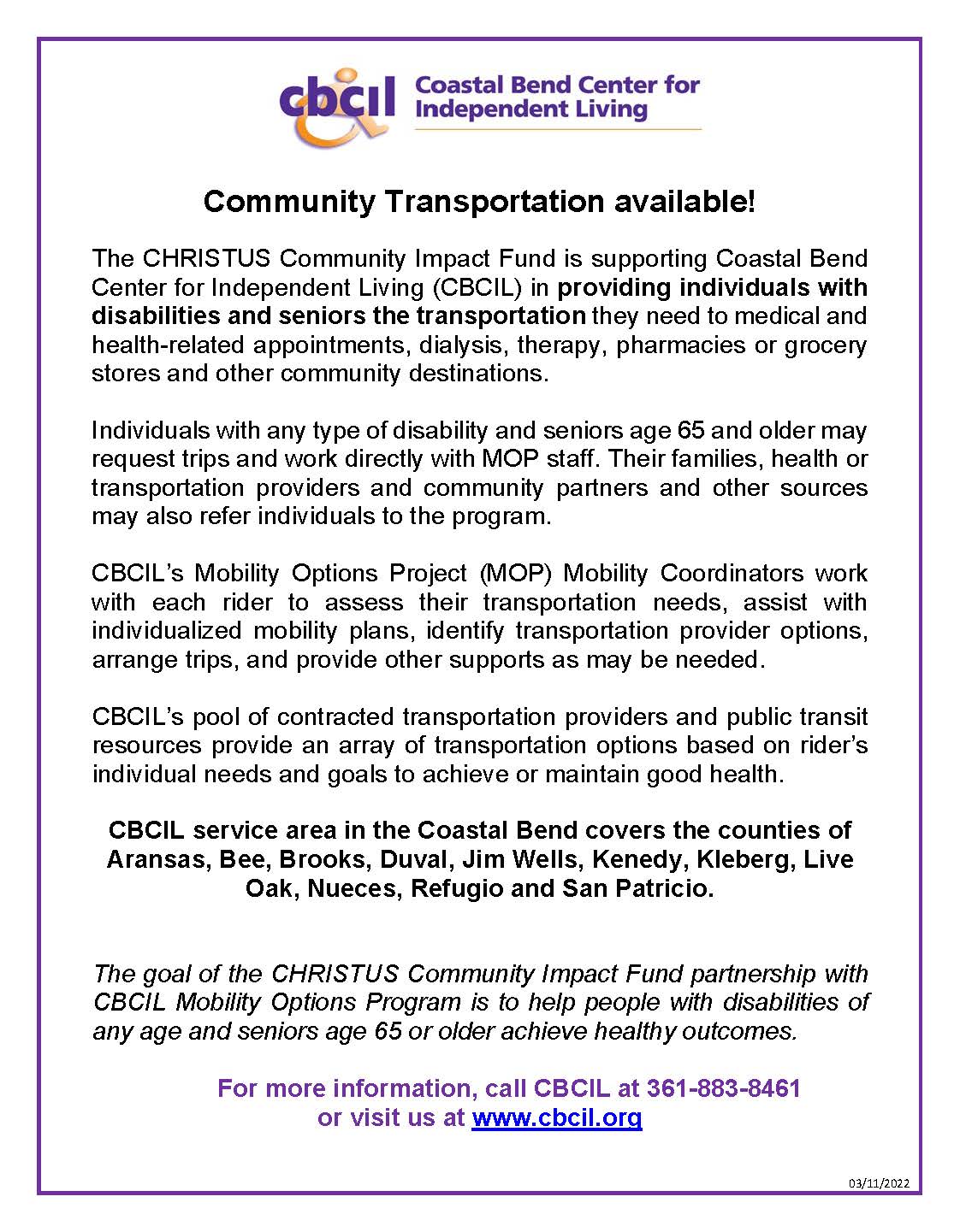 CBCIL’s Mobility Options Program (MOP) assists individuals with disabilities of all ages and individuals aged 65 and up with affordable, accessible transportation. Trips can be to doctors appointments, therapy, run errands or even see friends and family. Call us at 361-883-8461 for more information and to schedule transportation for your needs!