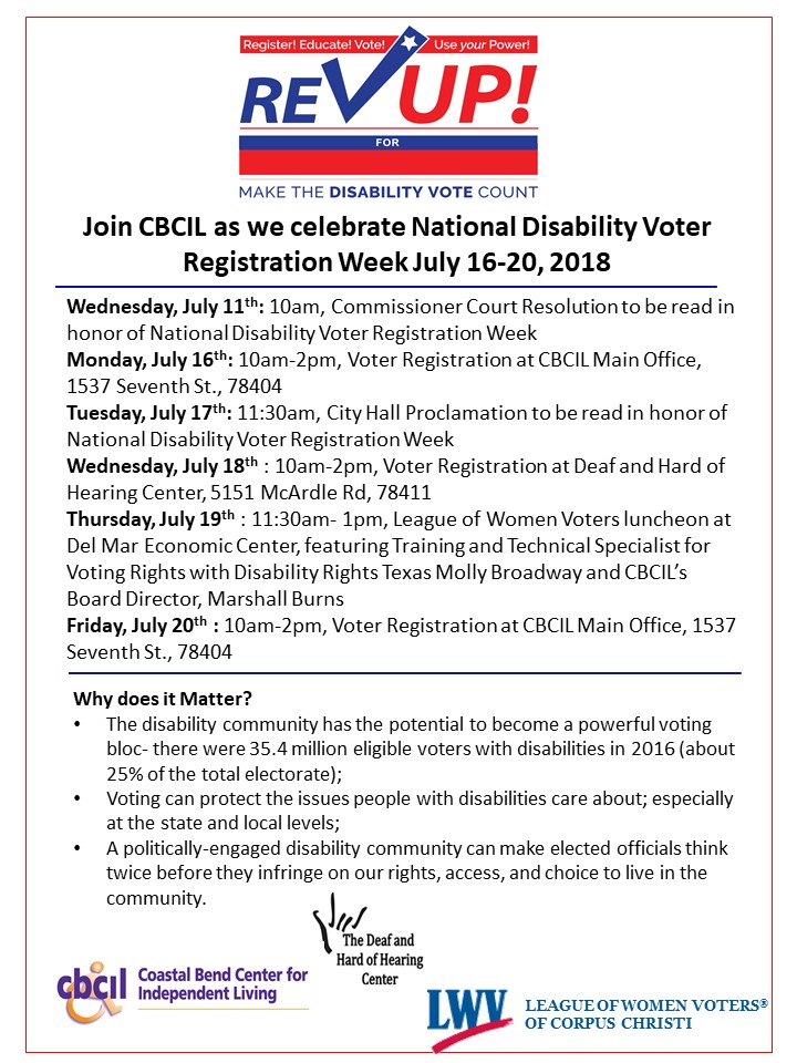 The Coastal Bend Center for Independent Living (CBCIL) and our partners the League of Women Voters, The Deaf and Hard of Hearing Center, and the Behavioral Health Center of Nueces County are hosting several voter registration events over the next week, to ensure people with disabilities become registered to vote.